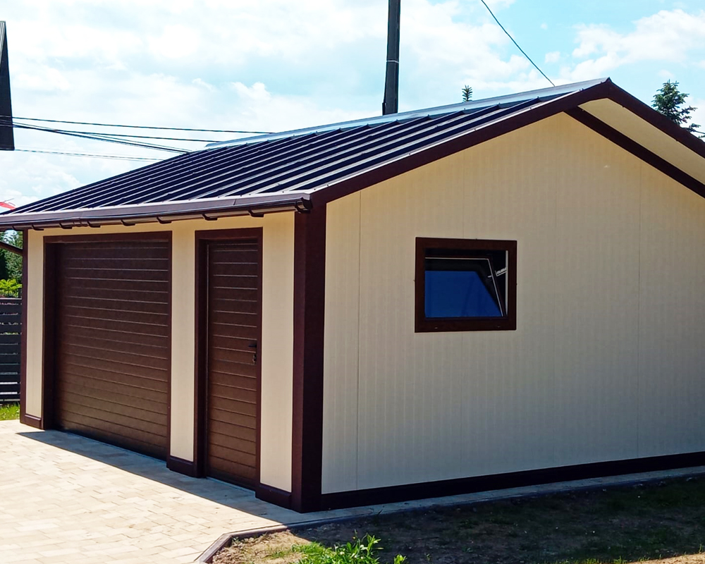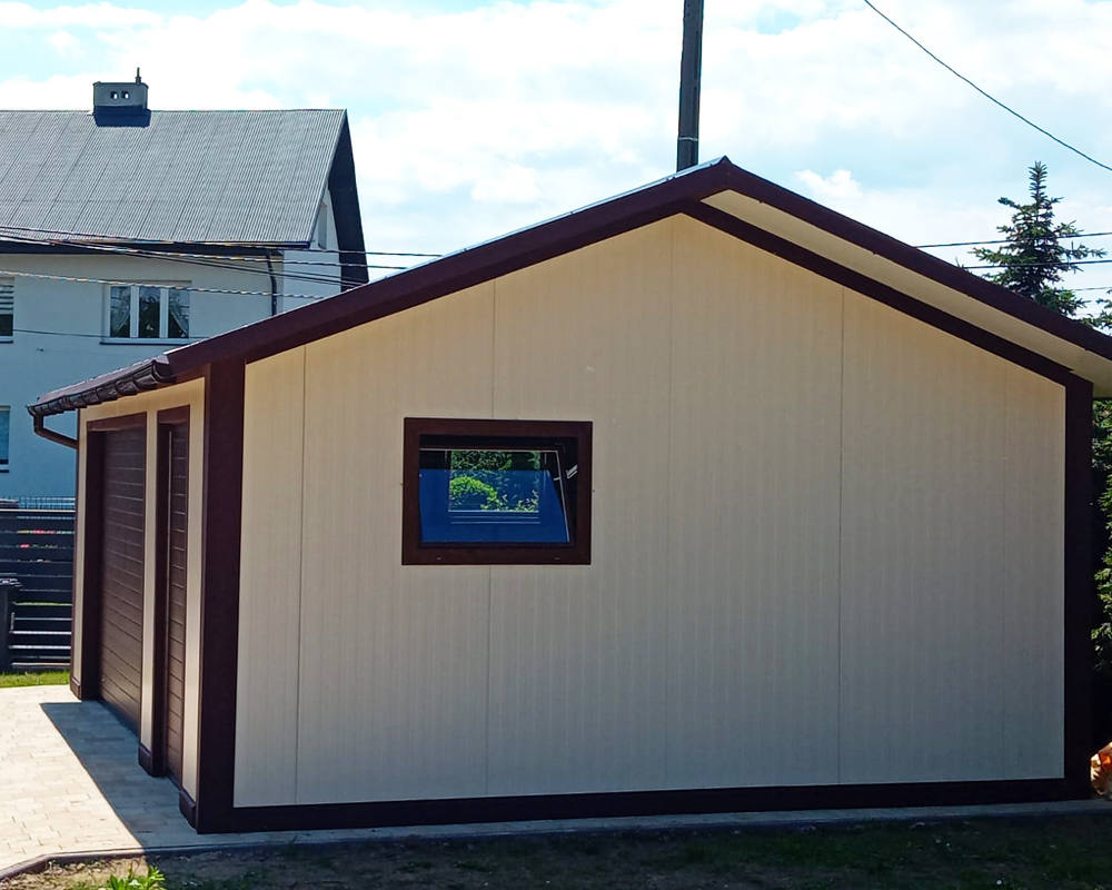 Garaż 5×6 m z płyty warstwowej BEŻOWY 1015 – brama segmentowa + automat