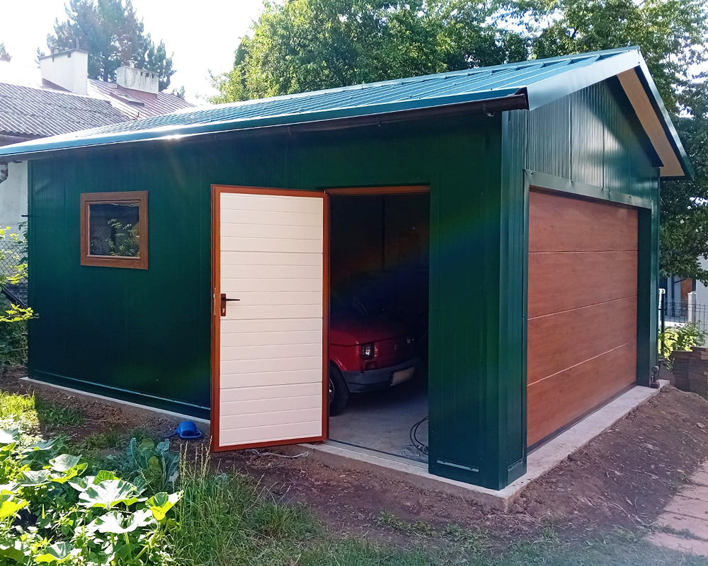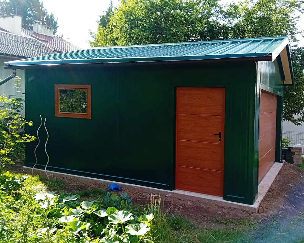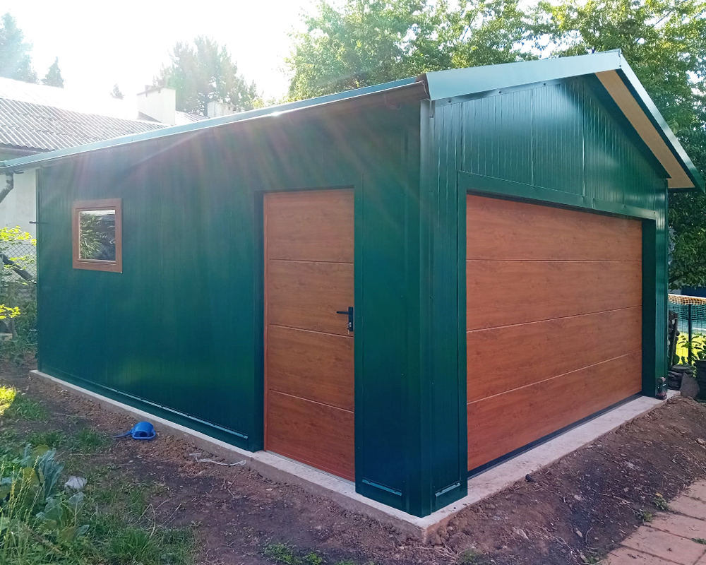 Garaż z płyty warstwowej 5×5,5 m – ZIELONY – dwuspadowy + brama segmentowa z automatem