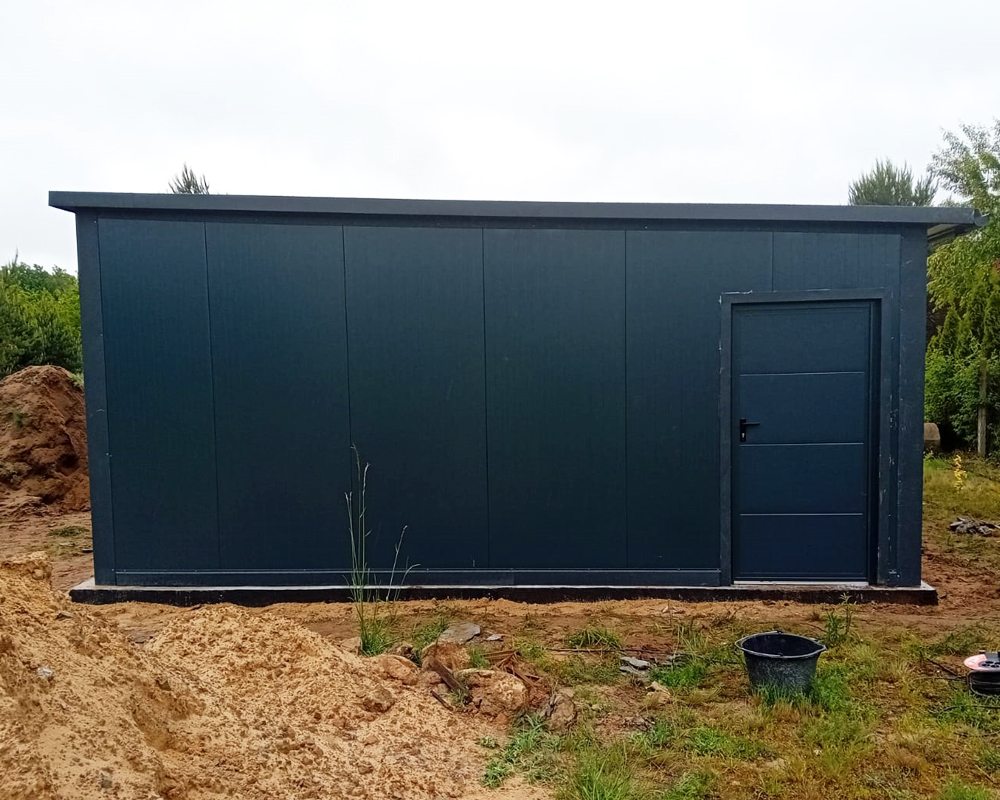 - ściany z płyty warstwowej 60 mm, w kolorze grafitowym